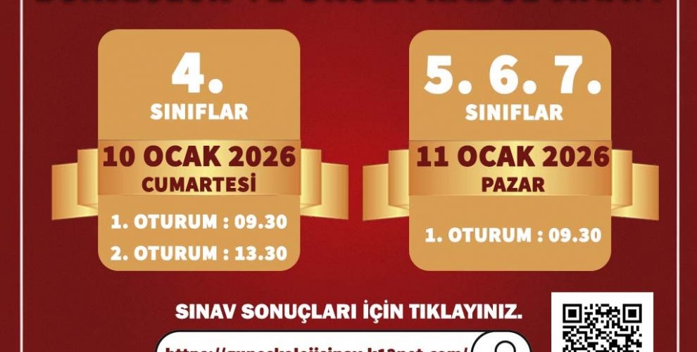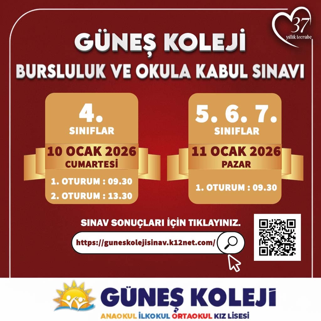 10-11 Ocak 2026 tarihlerinde 4. Sınıf, 5. Sınıf, 6. Sınıf ve 7. Sınıf öğrencilerine yönelik gerçekleştirdiğimiz bursluluk ve okula kabul sınavımızın sonuçlarına ulaşmak için aşağıdaki görsele tıklayınız.Bilginize sunar, hayırlı günler dileriz.